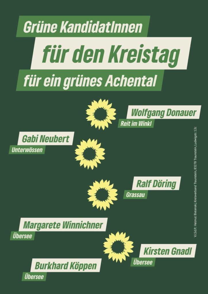 Reit im Winkl, Unterwössen, Marquartstein, Grassau und Übersee haben einen gemeinsamen Flyer für die Kandidatinnen und Kandidaten aus dem Achental für den Kreistag. Verteilt wird dieser ab Ende Januar als Einlage der grünen Wahlwerbung für den Kreistag. Hintergrund für einen gemeisamen Flyer war, die Grünen Orstverbände aus dem Achental zu vernetzen, sich auszutauschen und gemeinsame Aktivitäten zu planen, denn die Themen, die uns alle beschäftigen, enden ja nicht am Ortsrand und gemeinsam sind wir stärker!