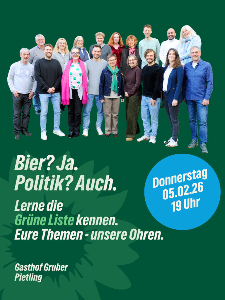 Komm vorbei auf ein Bier und nutze die Gelegenheit zum persönlichen Gespräch mit der Bürgermeisterkandidatin und den Kandidierenden der Grünen Liste Fridolfing!